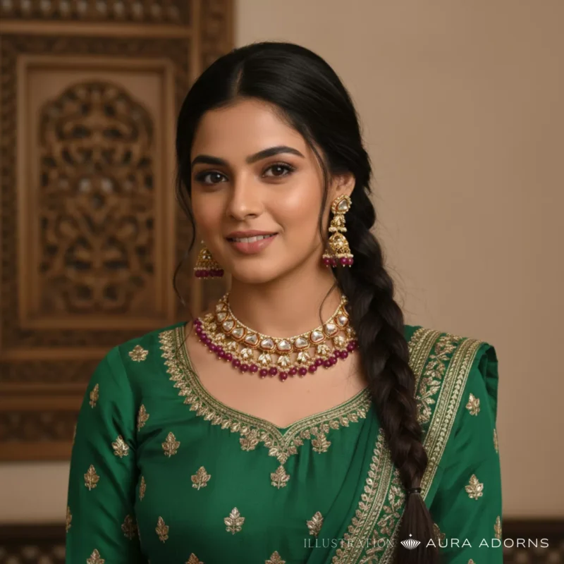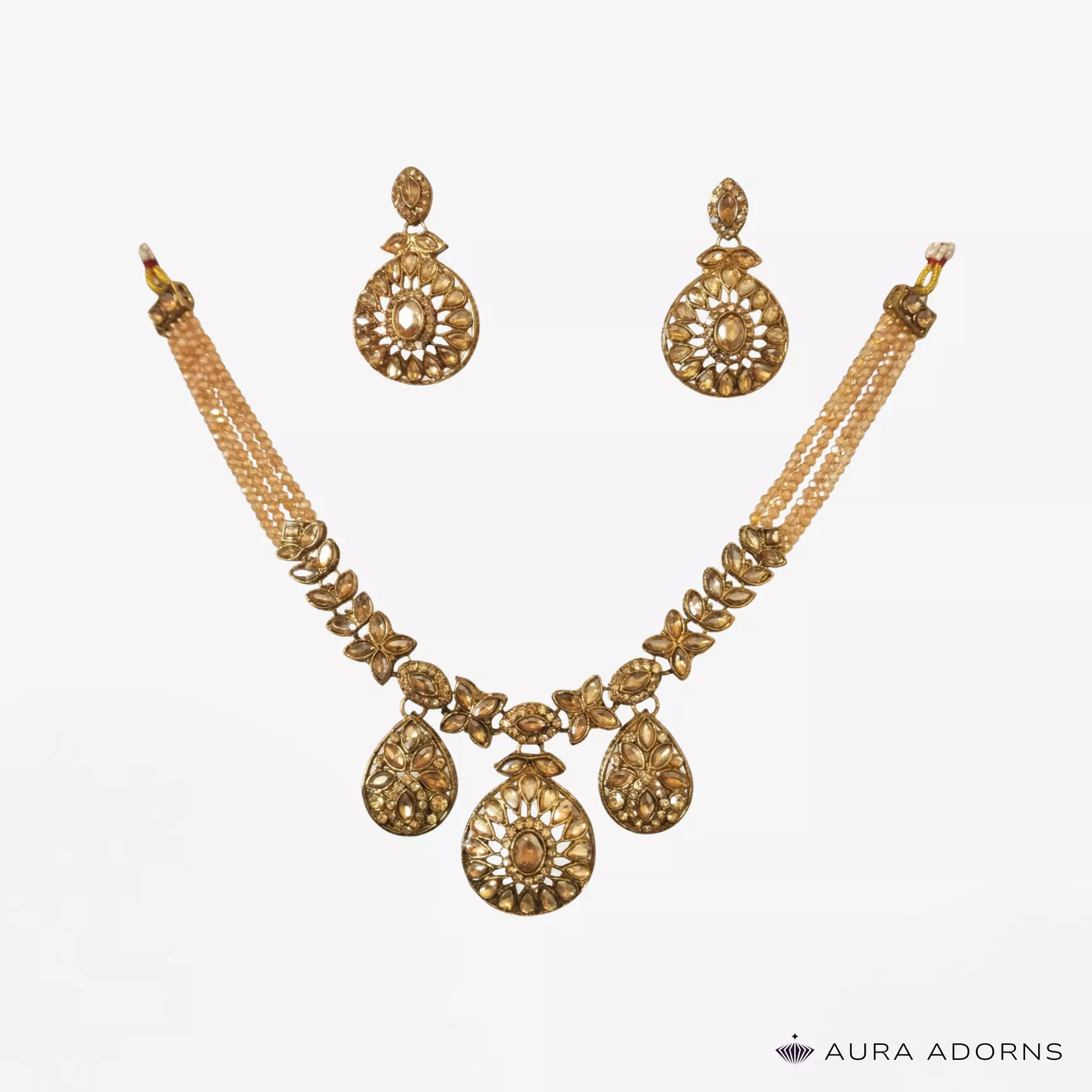 Radiate elegance with this traditional necklace and earring set, featuring teardrop and oval golden stones arranged in graceful floral patterns. With delicate bead strands and intricate detailing, it’s a timeless choice for weddings and festive occasions,