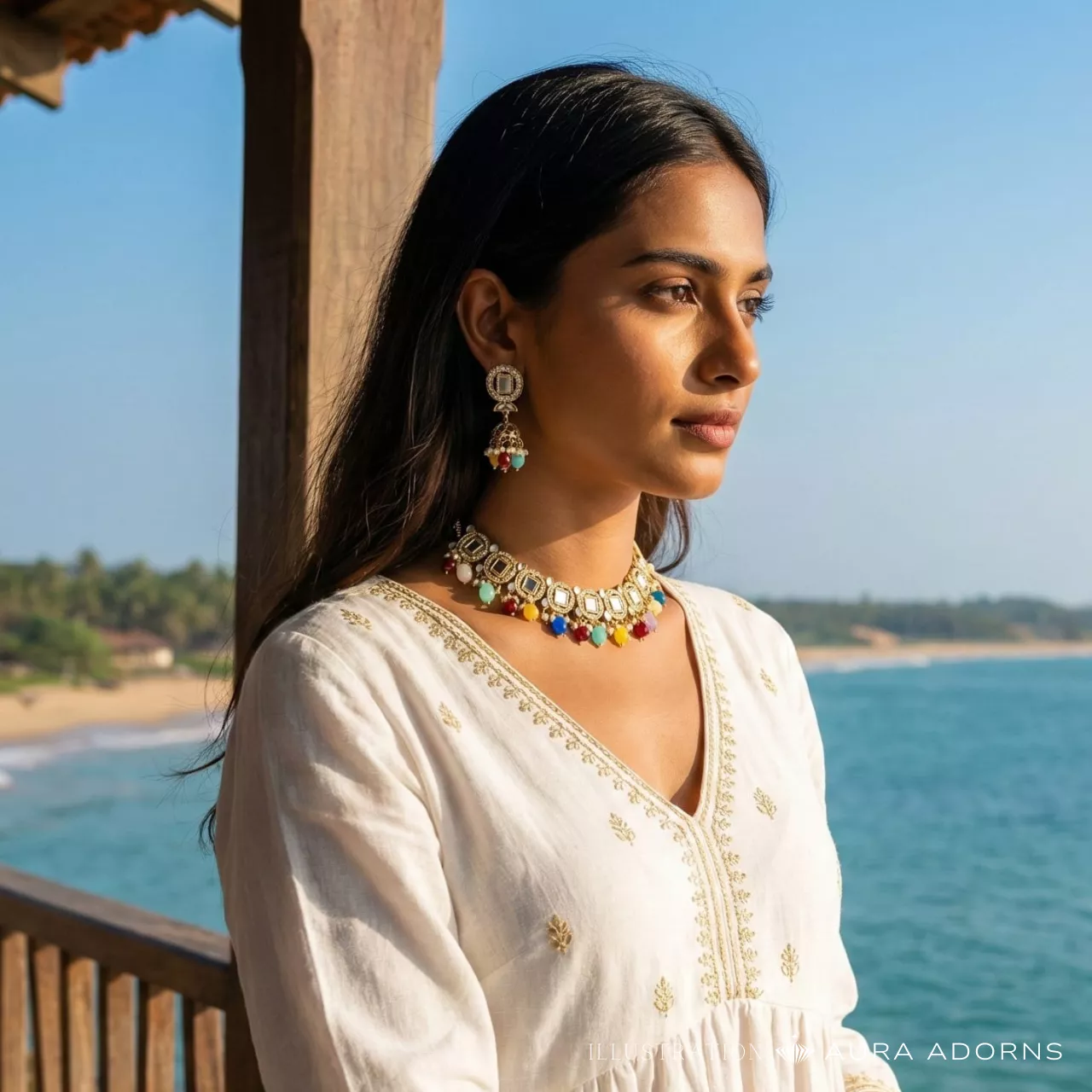 This choker set features square mirror‑style stones framed with delicate crystal accents, arranged gracefully along the neckline. Dainty pearl clusters and vibrant bead drops add movement and a soft pop of colour. The set is paired with matching jhumka‑style earrings adorned with Kundan studs, pearl details, and coordinated beads for a beautifully balanced, statement look.