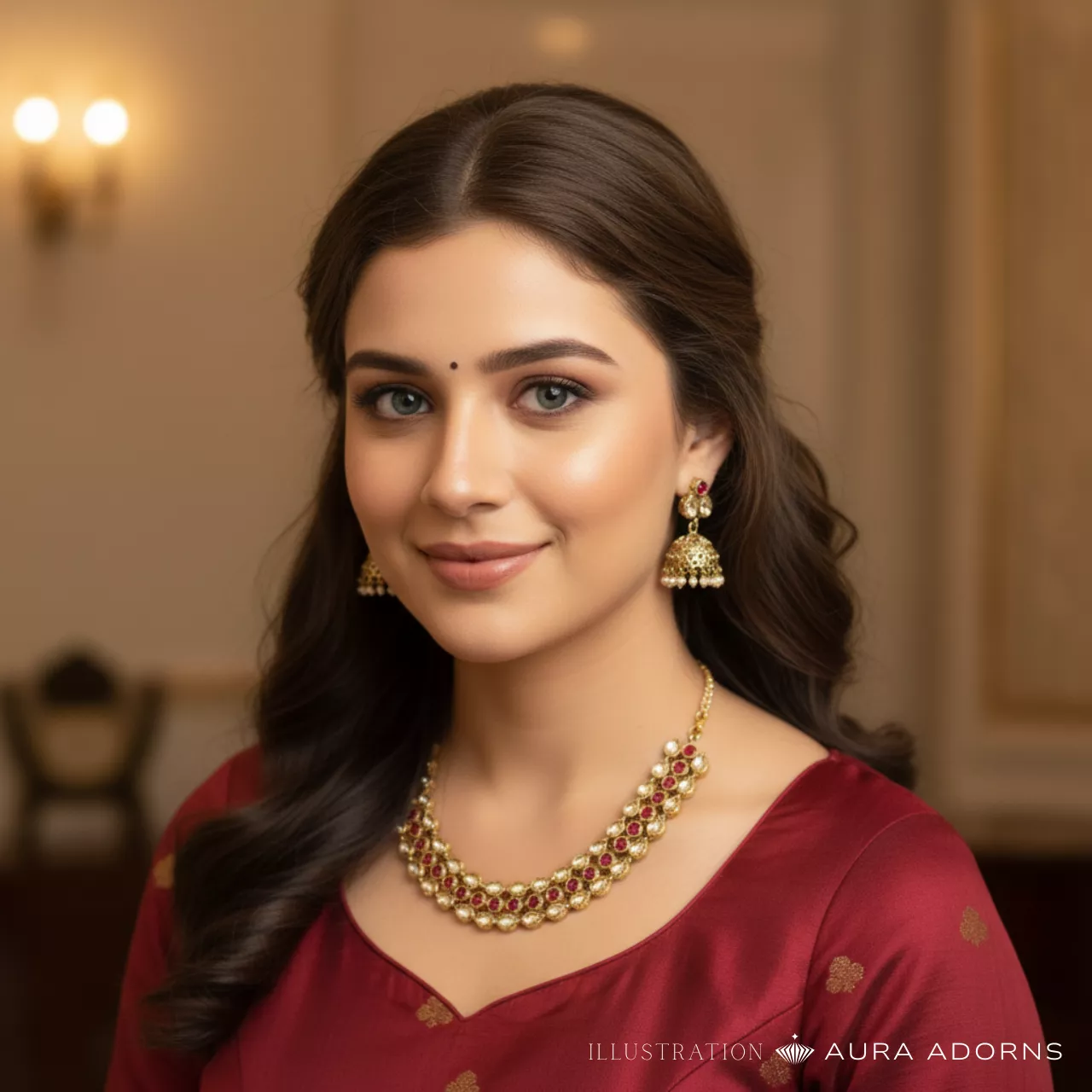 Turn heads with this striking choker-style necklace set, featuring a graceful blend of teardrop golden stones and rich pink accents, all set in a golden frame. The matching jhumka earrings echo the design with pearl drops that add a soft, traditional touch. Perfect for weddings, festive occasions, or evening wear, this set brings together classic charm and modern elegance in one beautiful ensemble.