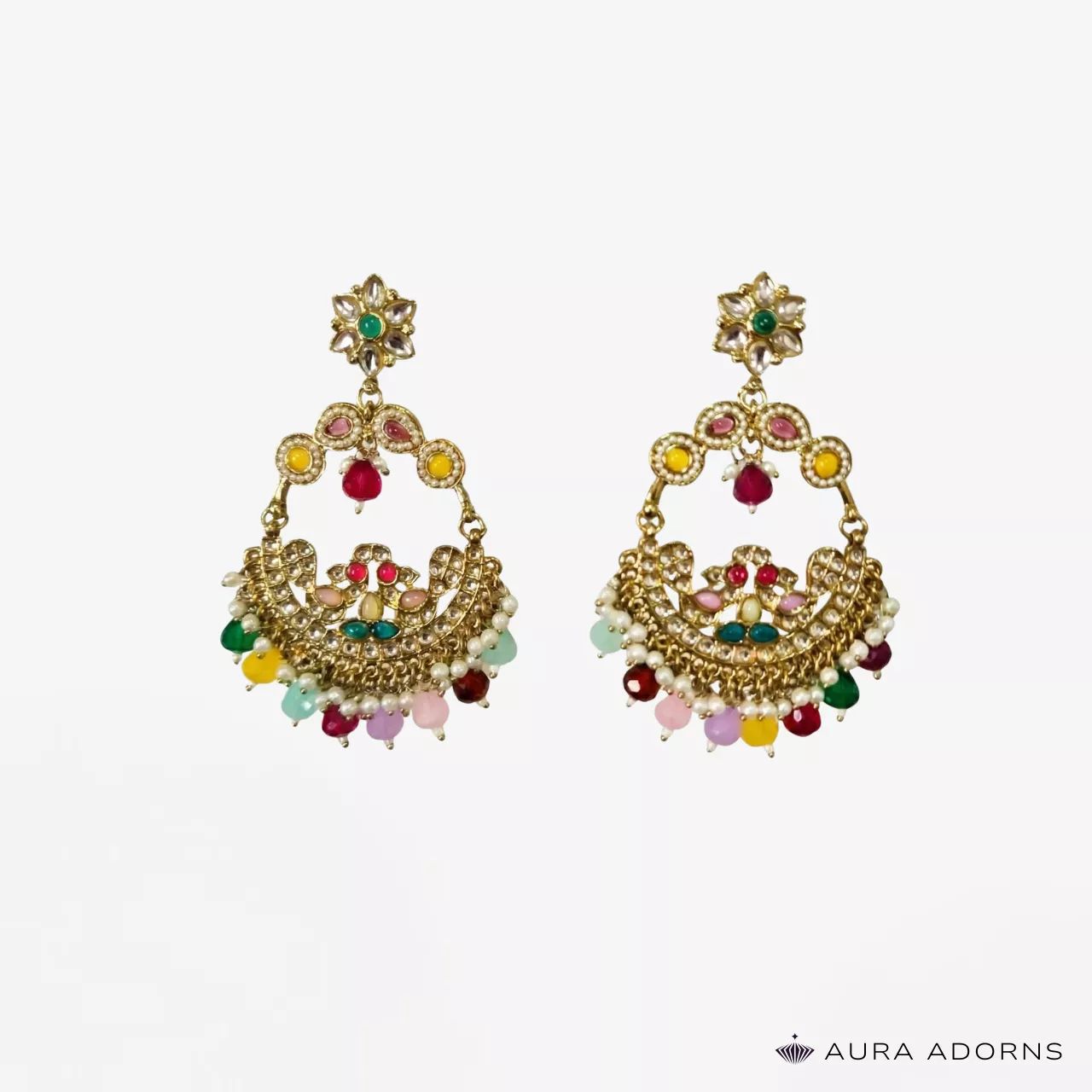Make a bold statement with these handcrafted chandbali earrings, featuring a radiant floral stud, petal‑shaped stones, and a beautifully arched silhouette. The crescent base is adorned with sparkling kundan work, rich enamel accents, pearl clusters, and multicolour gemstone drops, all finished in an antique gold tone for a regal, heirloom-inspired look.